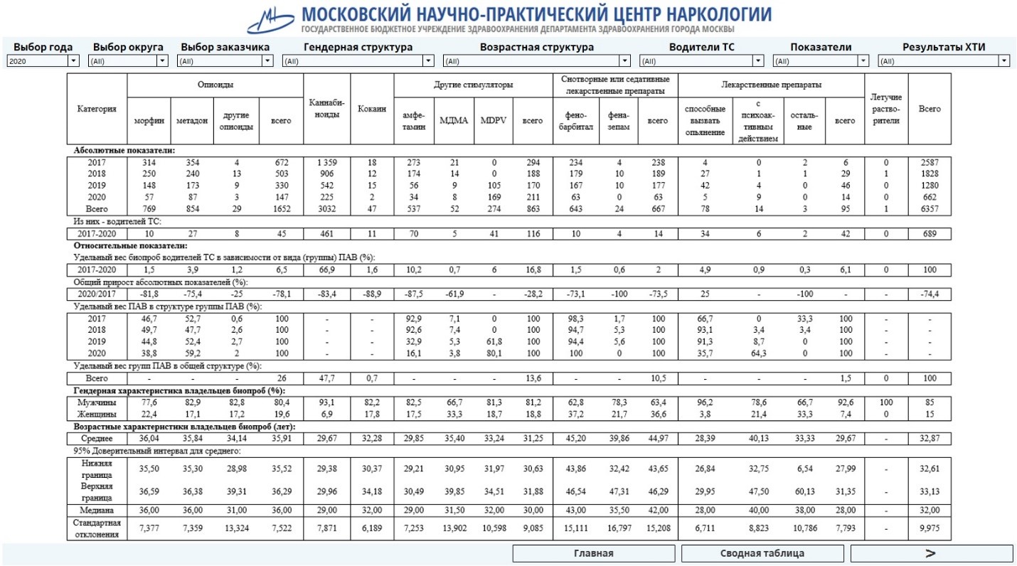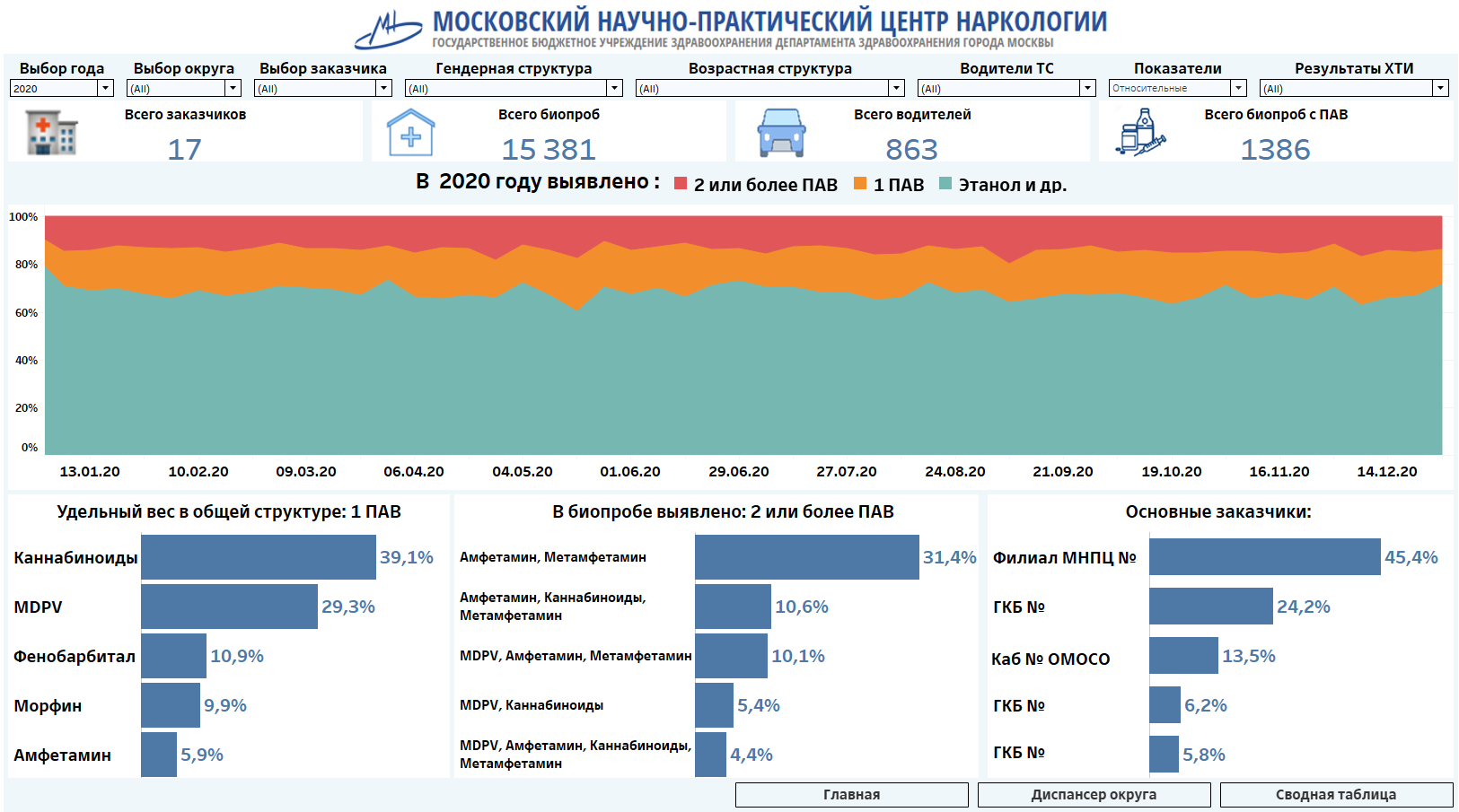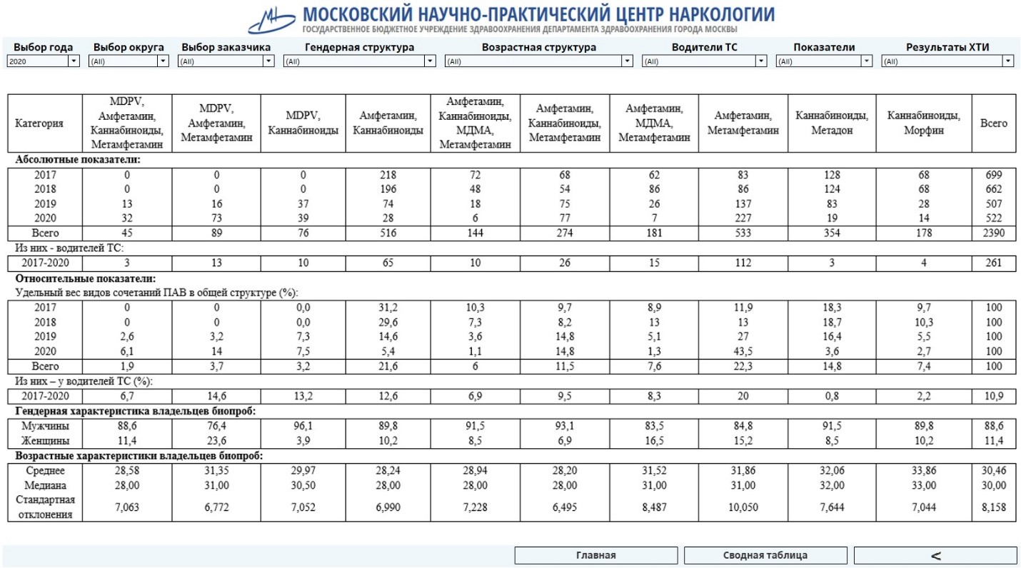 Представленный интерактивный отчет иллюстрирует имеющийся диссонанс между структурой потребления групп ПАВ в АО Москвы и первичным выявлением пациентов с диагнозом наркомания. Использование подобного подхода позволяет объективизировать как действительную «картину» потребления ПАВ (групп ПАВ), так и повысить эффективность «тестирования» населения в наркологических диспансерах за счет использования информации о наиболее часто выявляемых по результатам ХТИ биопроб ПАВ (группах ПАВ), а также возрастной и гендерной характеристиках владельцев биопроб.