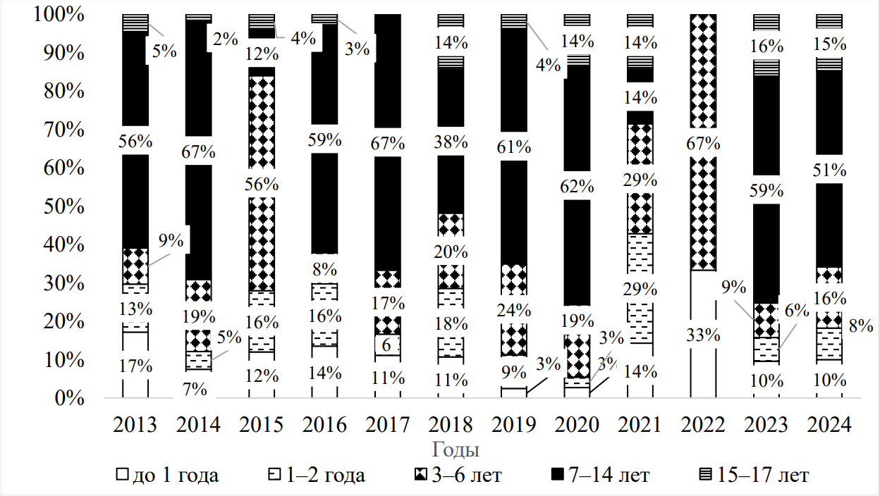 Проведен анализ структуры заболеваемости коклюшем детей по возрастным группам в АК за 2013–2024 гг. (Рисунок 3).