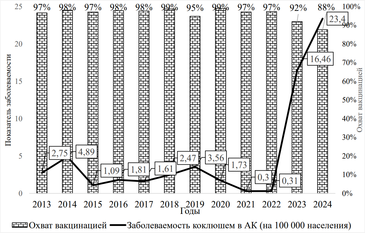 Рисунок 4. Динамика заболеваемости коклюшем в Алтайском крае за 2013–2024 гг. (на 100 000 населения) и охват вакцинацией против коклюша (в %)