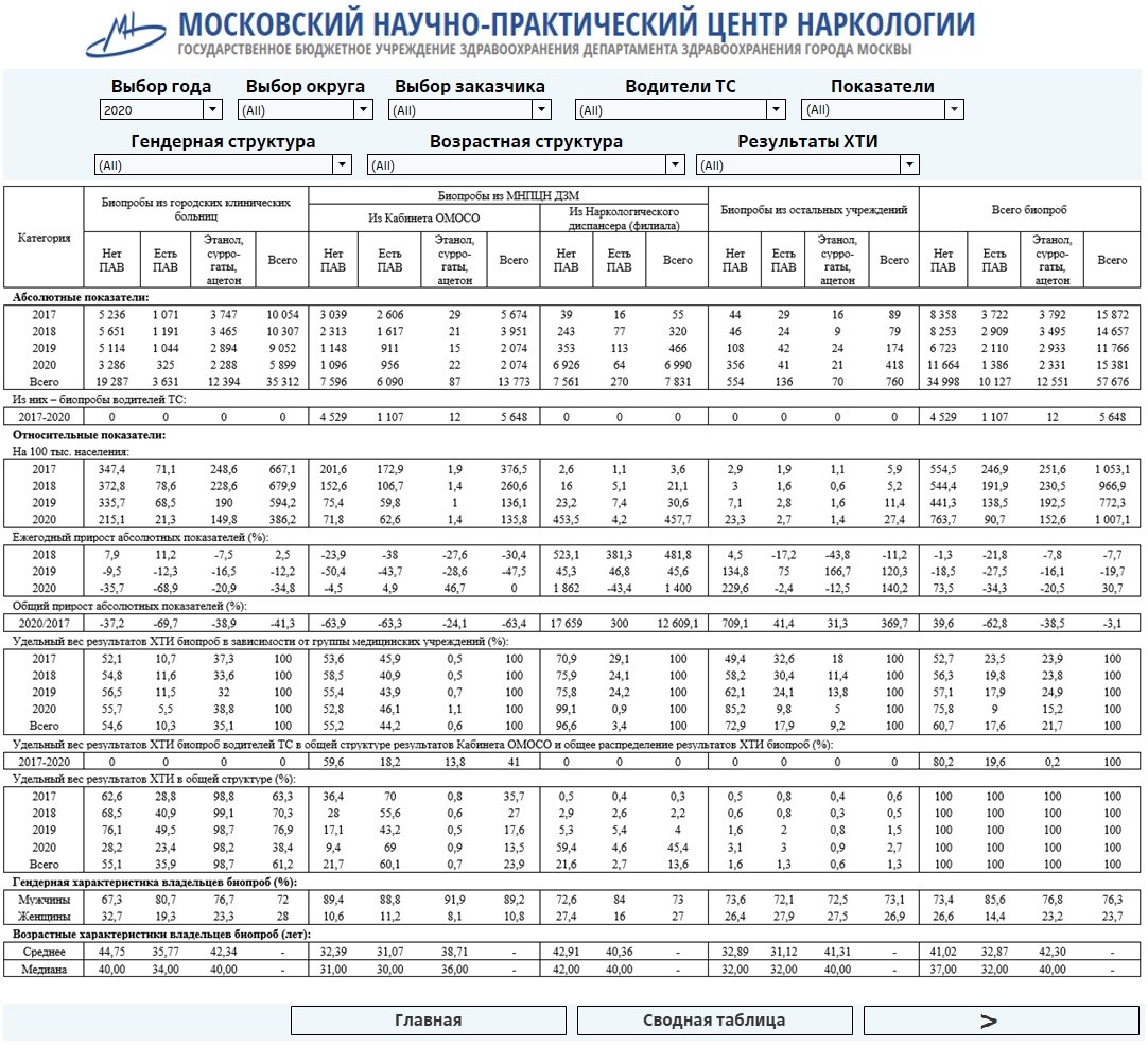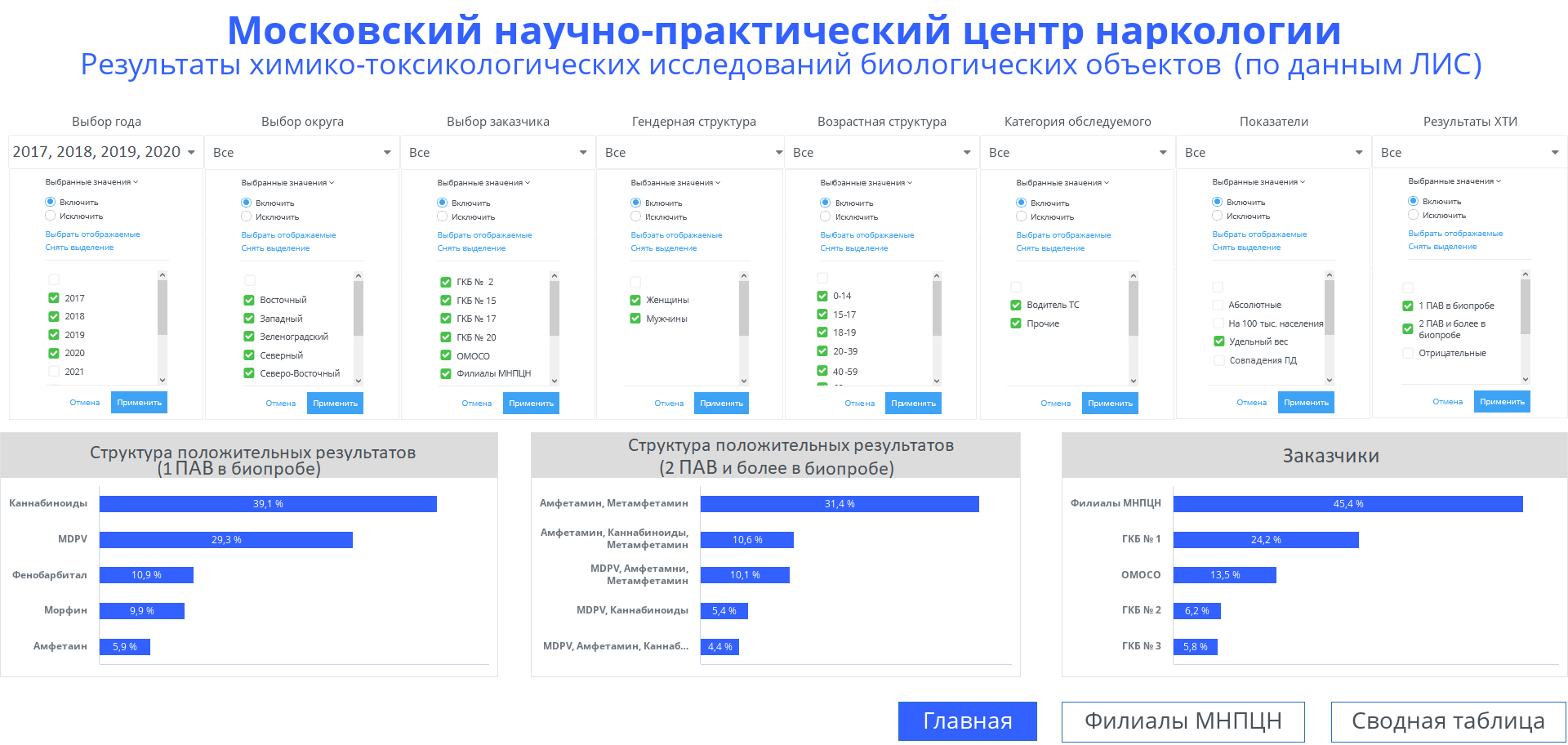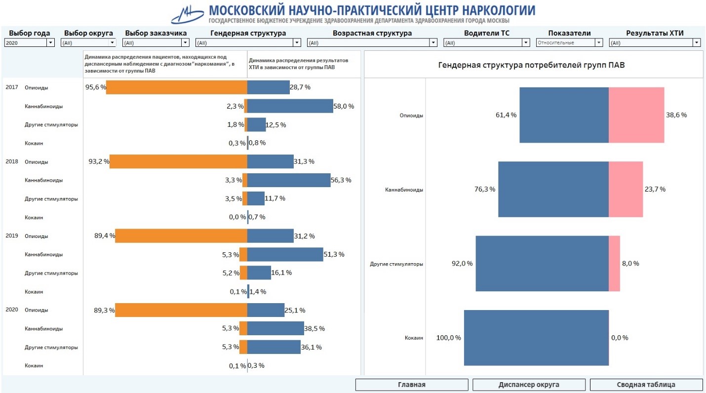 Представленный интерактивный отчет иллюстрирует имеющийся диссонанс между структурой потребления групп ПАВ в АО Москвы и первичным выявлением пациентов с диагнозом наркомания. Использование подобного подхода позволяет объективизировать как действительную «картину» потребления ПАВ (групп ПАВ), так и повысить эффективность «тестирования» населения в наркологических диспансерах за счет использования информации о наиболее часто выявляемых по результатам ХТИ биопроб ПАВ (группах ПАВ), а также возрастной и гендерной характеристиках владельцев биопроб.