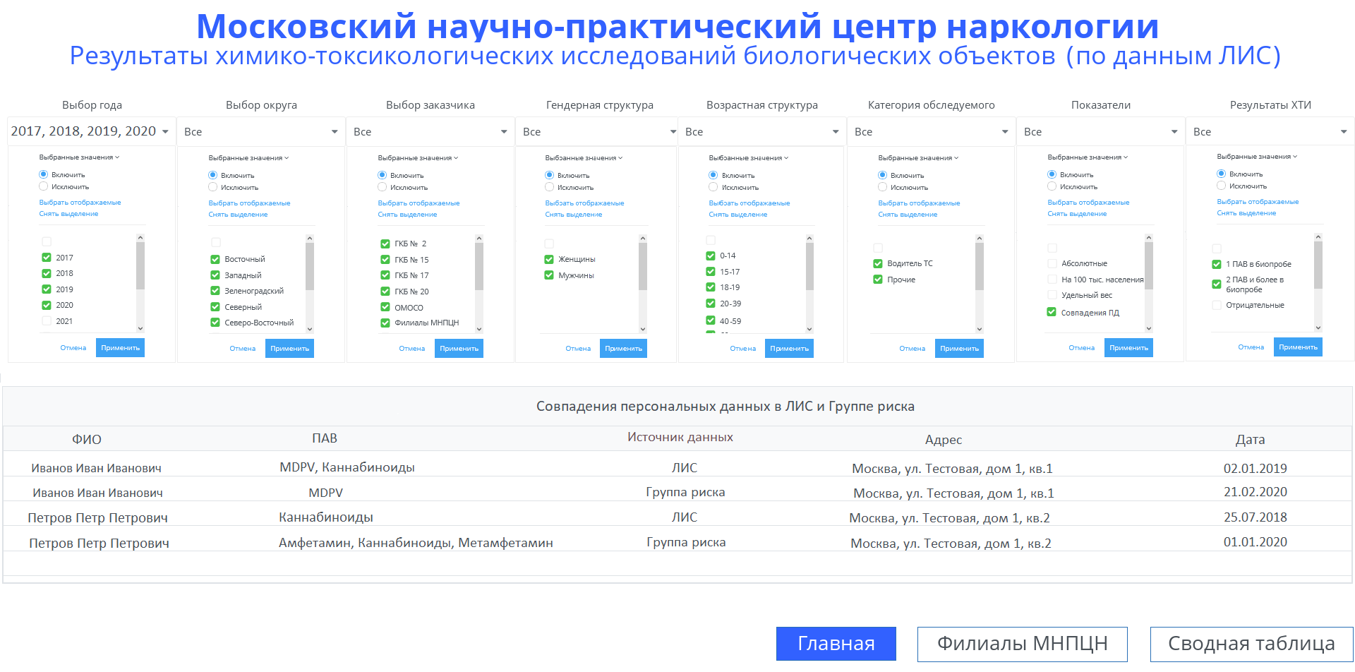– использованием различных типов графиков и визуальных элементов для визуализации данных как о положительных результатах ХТИ биопроб (ПАВ или группах ПАВ), так и о владельцах этих биопроб;