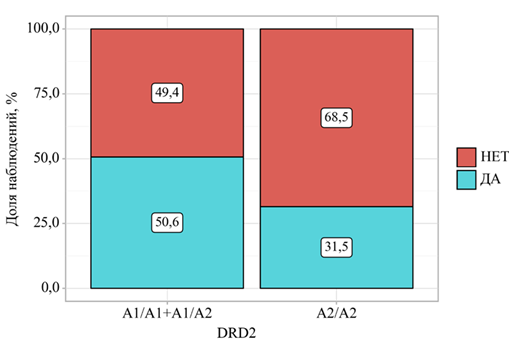 В статье отражены результаты обсервационного одномоментного исследования в области подростковой наркологии. Представлена актуальная информация об употреблении психоактивных веществ (ПАВ) подростками и его связи с полиморфизмом гена DRD2 (rs1800497), кодирующего дофаминовый рецептор 2 типа. Целью работы являлось изучение ассоциации данного генетического маркера с формированием наркологической патологии у лиц подросткового возраста. В исследование включено 188 подростков в возрасте от 15 до 18 лет. Проведен анализ распределения частот генотипов и аллелей, оценена связь носительства аллеля A1 с качественными и количественными показателями потребления различных классов ПАВ, а также с потребностью в стационарном лечении. Установлено, что носители аллеля A1 (генотипы A1/A1 и A1/A2) достоверно чаще пробуют и в последующем злоупотребляют синтетическими каннабиноидами, синтетическими катинонами, галлюциногенами и летучими органическими веществами по сравнению с гомозиготами A2/A2. Выявлен дозозависимый эффект аллеля A1 в отношении употребления синтетических катинонов. Наличие хотя бы одного аллеля A1 ассоциировано с более высокими шансами госпитализации в наркологический стационар. Полученные данные позволяют рассматривать аллель A1 гена DRD2 как значимый маркер риска формирования наркологического расстройства у подростков.