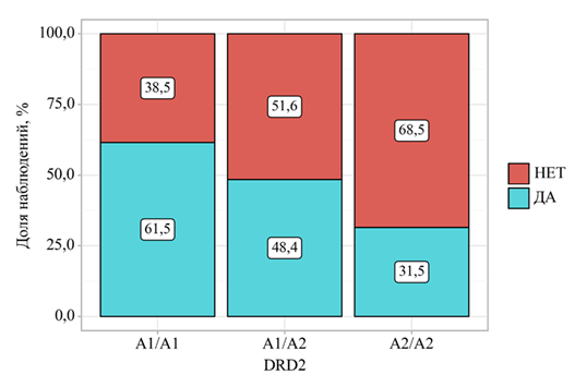 Особого внимания заслуживает выявленная связь аллеля A1 с потребностью в стационарном лечении. Шансы быть госпитализированным у носителей A1 оказались в 2,23 раза выше, чем в группе A2/A2, причём максимальные показатели зафиксированы в группе A1/A1 (61,5%). Это может указывать не только на более интенсивное употребление, но и на развитие более тяжёлых форм зависимости, требующих медицинского вмешательства, что согласуется с концепцией «синдрома дефицита вознаграждения» и повышенной коморбидности у носителей риск-аллелей [2, 6, 9].