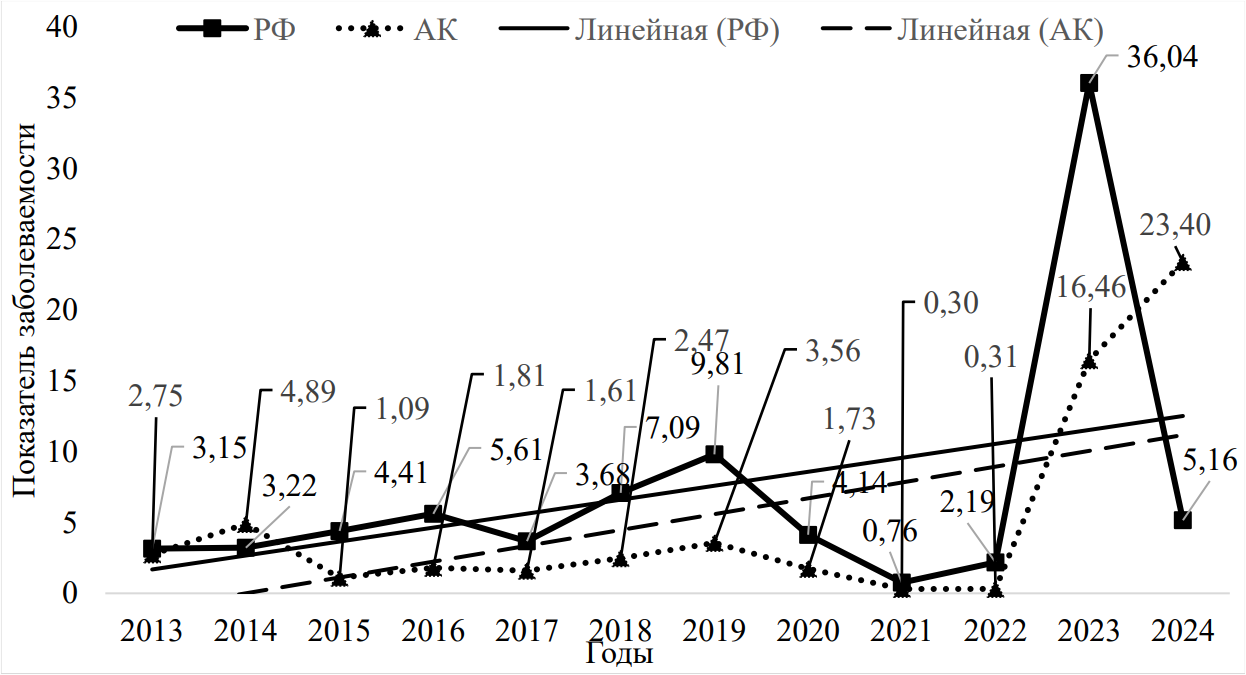 Динамика показателя общей заболеваемости в АК имела тенденцию к подъему в 8,5 раз (с 2,75 о/оооо в 2013 году (95 % ДИ 2,71–2,79) до 23,4 о/оооо (95 % ДИ 23,1–23,7) в 2024 году). Среднегодовой показатель заболеваемости составил 4,8 о/оооо (95 % ДИ 4,74–4,86) что в 1,5 раза меньше, чем по РФ (7,1 о/оооо (95 % ДИ 7,02–7,18)). Максимальный показатель заболеваемости наблюдался в 2024 году и составлял 23,4 о/оооо (95 % ДИ 23,18–23,62). Минимальный показатель заболеваемости зарегистрирован в 2021 году – 0,3 о/оооо (95 % ДИ 0,28–0,32).