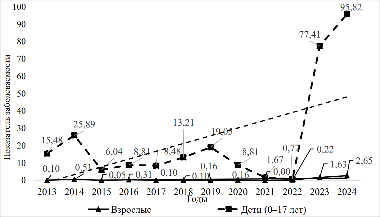 Проведен анализ динамики заболеваемости коклюшем взрослых (18 лет и старше) и детей (0–17 лет) по АК за 2013–2024 гг. (Рисунок 2).